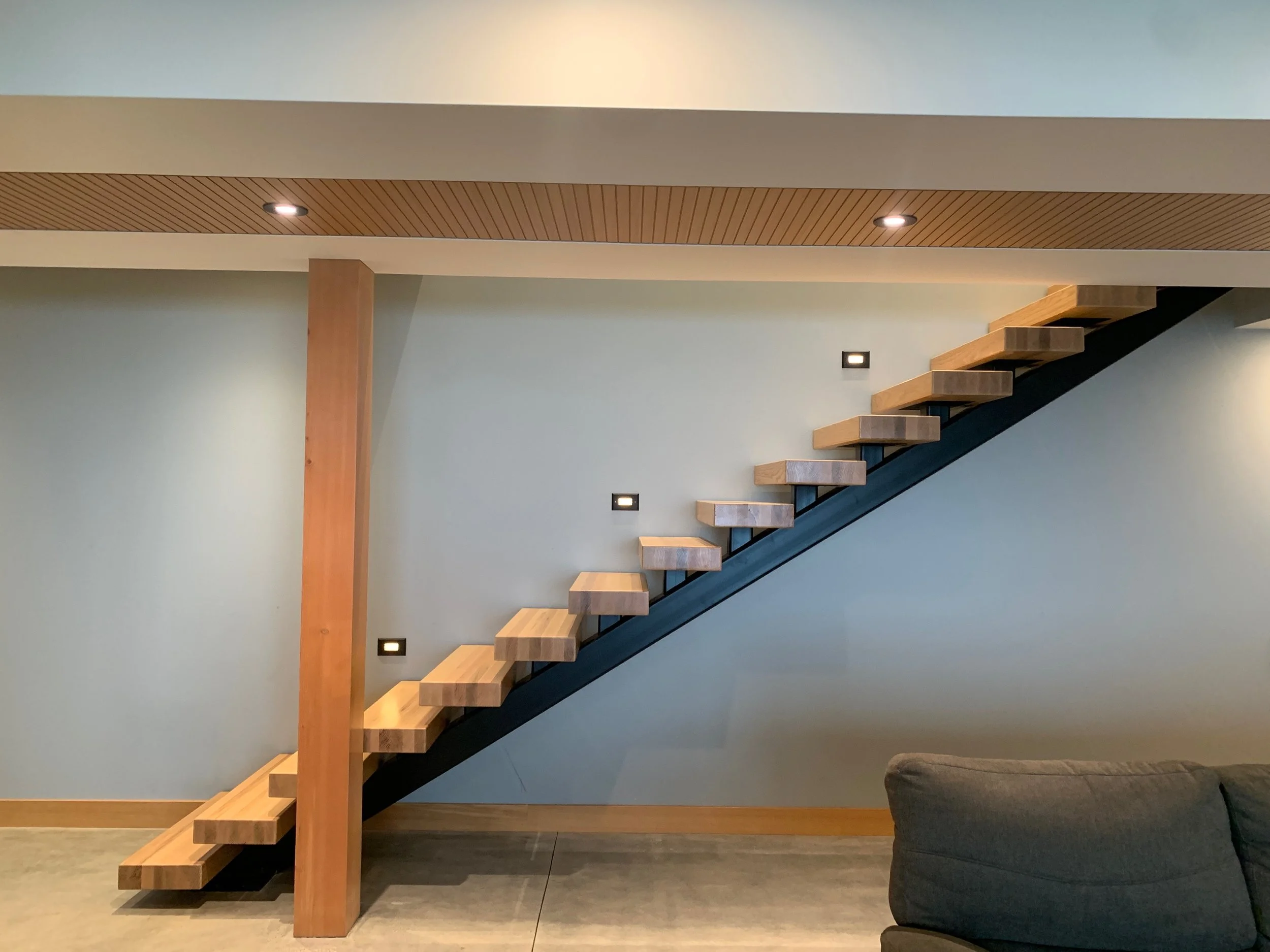 We did the kitchen, Laundry and some other architectural millwork finishing on this address in Comox. We were contacted by the client to do the finish work on their mono beam stair stringer as well which was fabricated locally by an expert metal worker. This was a challenging piece to complete simply for it’s sheer size. The stringer came in at almost 7 meters long and weighed roughly 270 kilograms so moving it was definitely a task. However we proved that we can handle virtually any object expertly and the finish came out looking fantastic. It is a water based interior metal finish that produces one of the hardest surfaces we’ve seen in our work. The colour and sheen are very consistent and the finish feels smooth and buttery while light reflection is optimal to both hide dust and dirt but produce just enough lustre to be catching to the eye. We were very happy to be a part of this project and happy to finish metal as well as wood.
